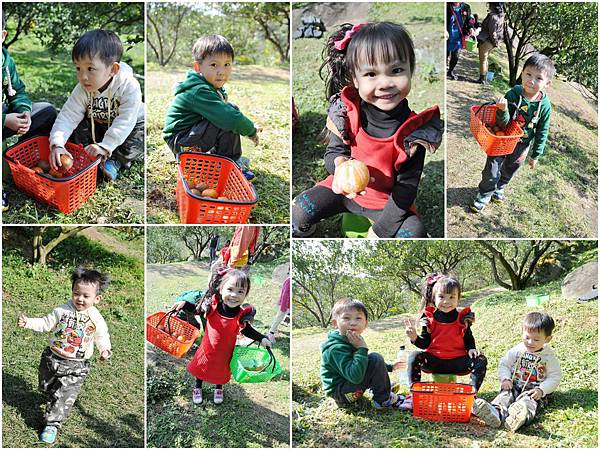 果園還挺大的,橘樹並不高,較矮樹梢上的果子,小恩跟萱萱都可以自行採果,只有小個兒阿倫倫需要阿母抱抱才摸得到橘子,不過...橘子也超好摘,劈哩啪啦,十分鐘又是摘了一大藍,停...先吃一吃吧~不然扛回家會重死人的。我、萱媽和萱萱橘子嗑得很開心,雖然外表醜醜的,但一剝開,濃郁的橘子味就飄出來,好吃ㄟ~~連不吃橘子的小子們也吃了幾瓣橘子汁(把橘子汁吸一吸,然後就把果肉吐出來,是人體榨汁機來著~@@) 接著,阿母們邊吃邊聊,小朋友們就在果園裡跑來跑去,反正整片果園都是草地,就算跌倒也不會受傷,就隨他們去發洩精力吧~暖暖的冬陽照著,沒多久就跑到小臉紅通通的~