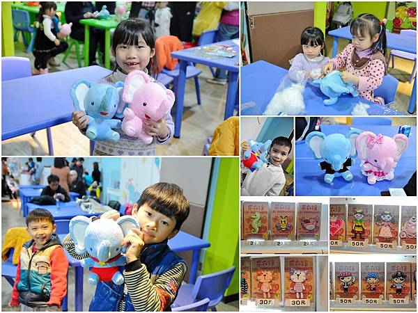 小朋友負責的工作就是把棉花塞塞塞塞進小象布套裡,然後現場的工作人員會作收口縫合的動作,接著就是選購配件,像是特殊服裝(超人裝、蝙蝠俠裝、小公主.....)還有配飾(皇冠、翅膀、貼圖、拼字....)小象本身就要350元,配件另計,然後加購盒子還要39元,整隻小象下來要500元上下~驚人的是旁邊有一整排的販賣機,有各式各項漂亮的圖樣,真的賺很大,哈!!