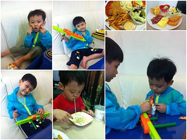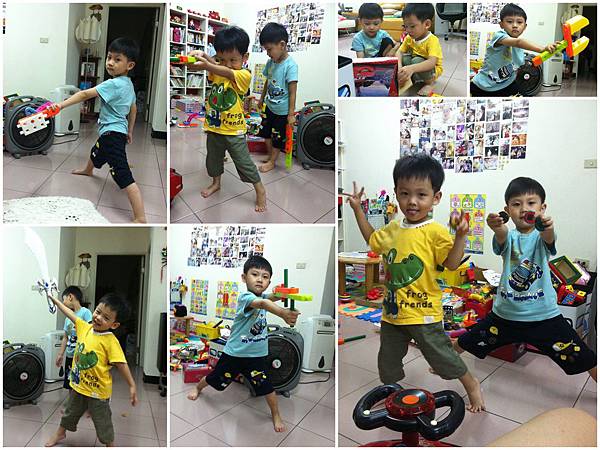 撐足了七天,兩兄弟才相見歡呀~一合體簡直要把屋頂給掀了~音樂不停地放,兩小子不是隨音樂起舞就是拿玩具廝殺著,然後想到就呼喚阿母備膳,早餐、甜點(甜甜圈)、午餐、下午茶(餅乾)、晚餐,還要找時間喝牛奶,超忙的兩位少爺呀!!要是逮到大爺有空,也要呼叫阿爸來當恐龍、怪物、壞人,兩個打一個,還準備了各種工具追著打,真要命呀~