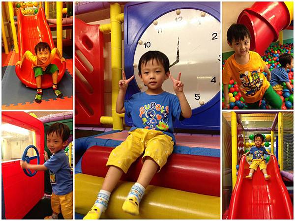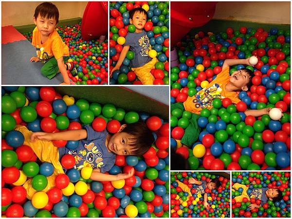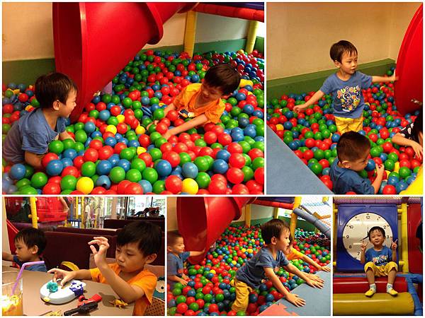一開始玩,只有五個小朋友,小恩還是最大的,所以我真的是坐在旁邊,一邊看他們玩一邊在FB發訊息,氣氛和樂融融的呀~可惜我們用餐完再上樓時,小朋友就變多了,十幾個人把整個球池給塞爆了~也真的有那種很大隻很皮的小鬼,看這麼多小孩擠在一塊玩,挺恐怖的,一下這個哭、一下那個哭,雖然阿母看得心怕怕,但小恩跟阿倫倫還是玩得好開心,真是容易滿足的小孩。