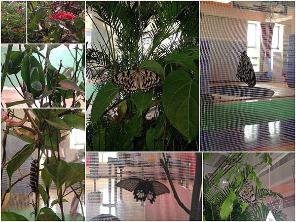 館內有各式各樣許多蝴蝶翩翩飛舞著,美極了,應該有超過100隻,當然...不可或缺的館內也有很多蝴蝶的寶寶們<-別稱,毛毛蟲。而且越是害怕的人越是容易看到,才入館,在第一棵盆栽上就發現綠體黑毛三兄弟,噁...瞬間一股寒意從背脊湧上,我就定格了...大爺晚一步入內,發現我怎麼就停在那動也不動,小子們連忙搶答"爸爸,你看,有好多毛毛蟲喔!"