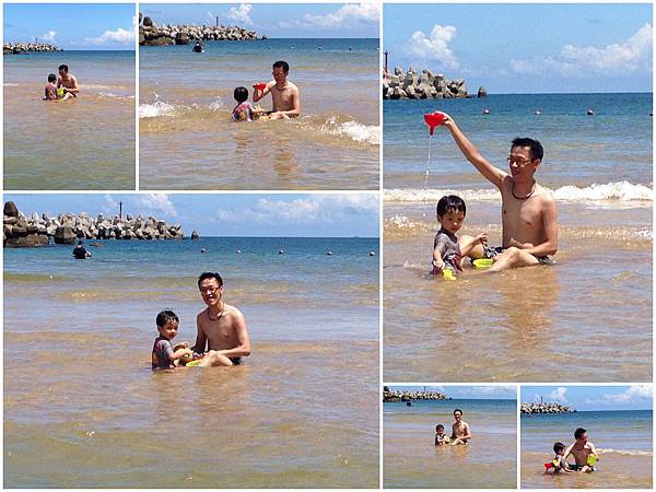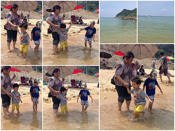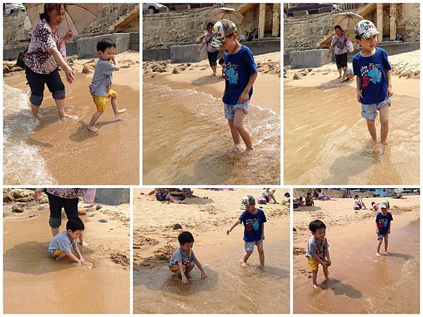 很神奇的是,海中有個沙洲,很多人都涉水過去,在淺灘那兒玩,阿倫倫跟著大爺整個人就直接坐在水裡頭,感覺超清涼的,但要越過一道水溝,水深及大爺的腰,小矮子又是旱鴨子的我沒種過去,只能在岸邊陪著也是沒膽子過去的小恩泡泡海水就好~