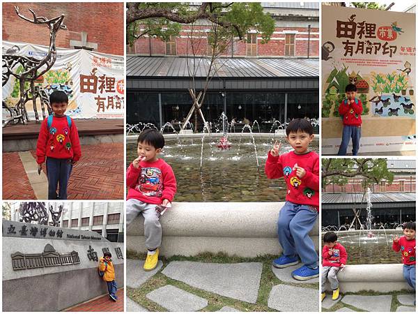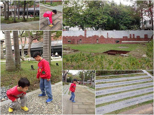 沿著水池鋪著的石塊,上面清楚的記載著這整個園區的演變史,從樟腦倉庫變成外貿會,又成為菸酒公司的配銷處,再被評定為國定古蹟,最後成為台博館的產業之一,阿不過,這純粹是阿母自己的補腦時間,小子們根本沒要聽"故事",光是在這綠樹步道間撿拾落葉、樹枝、尋找小昆蟲就夠他們忙和了,偶爾再跑回阿母身邊來補充點零食飲料,又繼續跑了~
