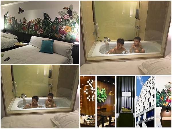 飯店風格走簡約的藝術時尚風,視覺很舒服、感覺挺愜意舒適的。喔..可惜電梯很迷你,一口氣上百人入住,電梯我們就等了好一會兒呢!我們住的是家庭房,約十坪大小,感覺床有加大~牆上的畫,鮮豔到讓人覺得到了熱帶雨林了!!最後恩、倫青睞的應該就是有浴缸可以泡澡,第一次覺得浴室用透明玻璃是件好事,我可以一邊在房裡整理東西,一邊看著在浴室玩翻天的小鬼~