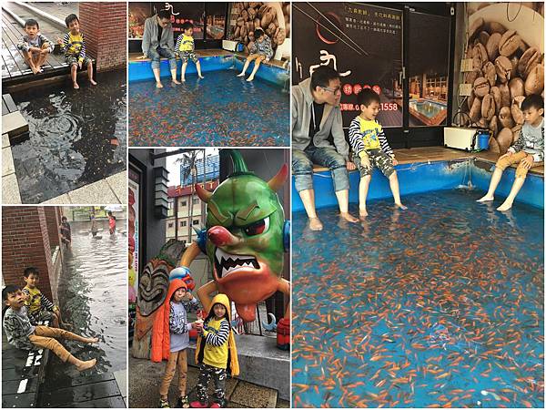 吃飽喝足後,就散步到我們期待已久的湯圍溝玩溫泉魚咬腳,從童話藝宿湯旅走到湯圍溝大概十分鐘,這兒的溫泉魚咬腳商家很多,我們選了離公眾泡腳池最近的一間,大人80元、小孩60元(送一條毛巾),我才剛結完帳,回頭就看見大爺跟恩、倫父子三個人興致勃勃的脫掉鞋子,迫不及待的泡水餵魚去了。