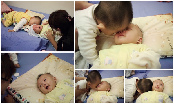 小恩現在很愛阿倫倫唷~每次看到都會給阿倫倫親親,只是小恩的親親,是整顆頭都獻上去(為娘的一直懷疑小恩其實是用額頭在跟人家親親的??),有時候一個過猛,扣,兩個小傢伙就撞在一塊,阿倫倫立刻就放聲大哭,小恩則是一臉茫然的看著阿倫倫,渾然不覺得自己做錯了什麼(廢話,他當然不覺得有錯,小恩不過就是想親親而已咩!) 很奇怪,我們從沒教小恩這樣,不知道為何有一天小恩突然對阿倫倫作出親親的動作,平常要小恩給我們親一下都很難,可小恩竟然會主動跟阿倫倫示好玩親親,真的讓我們又驚又喜的!!可以解讀為兩人感情好嗎??呵~~