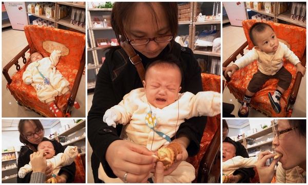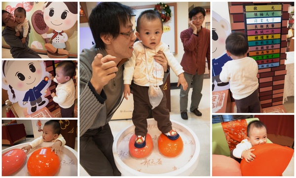 Dear作完動作,換小姑咩咩也來一遍,最後是米蟲,然後把餅乾吃掉,當然也分一點給小恩吃,呵~收涎餅奶味很重,挺好吃的唷!!(早知道應該多買一盒給公公婆婆吃,哈!!)接著又快速的帶阿倫倫去抽籤,結束流程立刻退到一旁準備餵奶呀~是的,阿倫倫餓了,一餓就大抓狂,整個收涎的過程都是哭紅著一張臉,好可惜呀!!趁著阿倫倫喝奶準備進入睡眠模式的時候,小恩則是在已經清空的會場玩了起來,沒有人跟小恩搶,他每一項都能玩上好幾遍呢!!小恩上回抓周最愛的登高梯,現在已經可以站得很穩了,一直玩按鈕,這次按到商業大亨呀~哈哈!!好...好...好...米蟲等著當貴婦啦!!