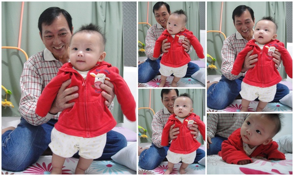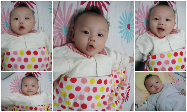 阿倫倫四個月囉! 其實四個月的第一件事,就是帶阿倫倫去收涎(之前紀錄過了),然後突然發現這個月的阿倫倫脖子硬了,可以直挺挺的撐著,這對我們來說是件很棒的事,因為阿倫倫喜歡人家直立式的抱他,這樣方便他東看西看,但脖子還沒硬之前,要直立抱,我們就一定要用兩支手,一隻手抱著另一隻手要護著阿倫倫的頸子,不用十分鐘,兩隻手就會痠到不行,像現在這樣,可以單手抱,另一隻手就能空出來泡牛奶或是收拾小恩亂丟的東西,呼,也算是小小的出運啦。