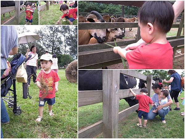 第一次看到活生生的牛,小恩剛開始怕怕地不敢靠近,教他拿牧草餵牛牛,幾次之後小恩就玩上癮了,一直要牧草,不過小恩的餵法是拿著牧草走到柵欄邊,看到牛一過來,就馬上把手鬆開,把牧草全丟到地上,牛牛只好低著頭,自己用舌頭捲起地上的牧草慢慢嚼呀~噗...小恩大概是怕小手也會被牛一口吞掉吧~哈!哈!哈!餵完了牛,Dear帶著小恩去看牛仔趕羊秀,不過,超快的,才五分鐘吧,就結束了,我懷裡的阿倫倫一直忙著把頭轉過來轉過去的,也不知道這短短的幾分鐘,阿是有沒有看到呀~~牛仔把羊趕到表演場地後,小恩也在欄杆外,開始餵起小羊來了,相較於之前的大牛,小羊容易親近多了,小恩也敢拿著牧草讓小羊慢慢的吃唷~