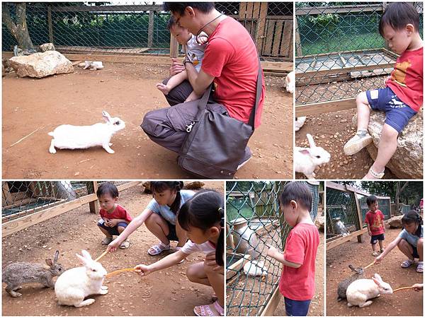 空曠的牧場,太陽直曬,快受不了啦~趕緊找了棵陰涼的大樹下休息,Dear跟米蟲媽咪去買了很香濃的牛奶霜淇淋,真的奶味很重呀~Dear讚不絕口!牧場的紅茶也很好喝ㄟ,而且不貴,當天我們就買了三四杯吧~休息片刻我又帶著小恩去親近兔兔,說真的這兒的兔子都好肥好大隻,別說小恩了,我都有點怕怕的,感覺兔子隨時都會張開血盆大口撲過來呀~哈哈哈哈~有一對小姊妹拿紅蘿蔔在餵兔兔,好心的媽媽也拿了根紅蘿蔔要給小恩餵,不過小恩一直把紅蘿蔔推回去,小小聲的說"不要",但眼睛卻直盯著紅蘿蔔看,搞不懂小恩到底是什麼意思ㄟ~是愛呷擱假客氣嗎??呵...謝過那位媽媽的好意,我們就離開了,等小恩再大一點膽子應該會再大些,到時候就不會這麼怕動物了吧~~