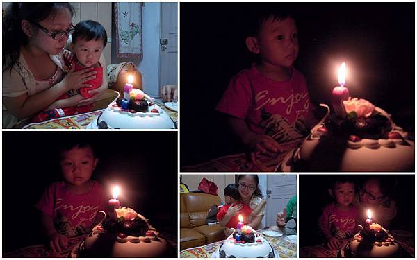 原本還很HIGH的小恩,看著蛋糕上的蠟燭,還很好奇直想去摸,沒想到一關燈,小恩的表情就定格了,大家開心的幫他唱著歌,小恩的嘴卻越來越癟,等到我們叫小恩吹蠟燭時,小恩已經紅了眼眶一副隨時會哭出來的樣子,無論我們怎麼哄,小恩就是不肯吹蠟燭,哇咧~哇咧~怎麼會這樣???怕小恩真的哭出來,就匆匆結束了吹蠟燭的儀式,直接切蛋糕囉!!