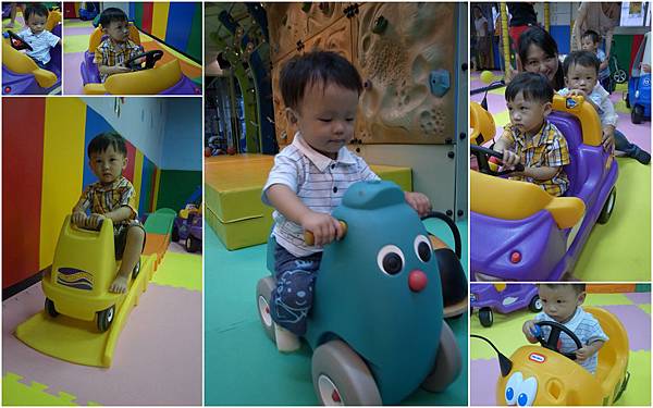 另外還有好多的車子唷~有搖搖車、嘟嘟車、腳踏車還有像小雲霄飛車一樣的軌道,小恩跟阿倫倫玩這個咻...滑下去的車車,玩最久~來來回回不下五六次,要不是後面有其他小朋友虎視眈眈的望著,還真捨不得停下來呢!!