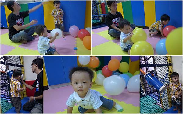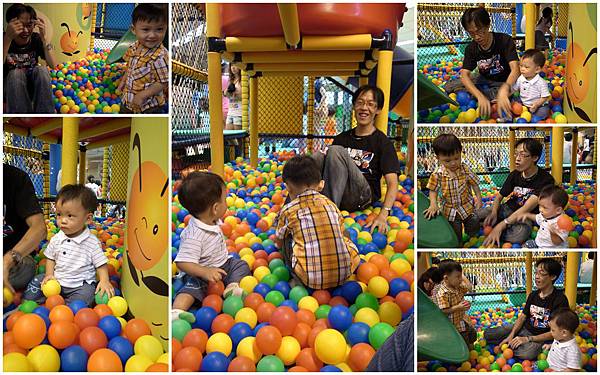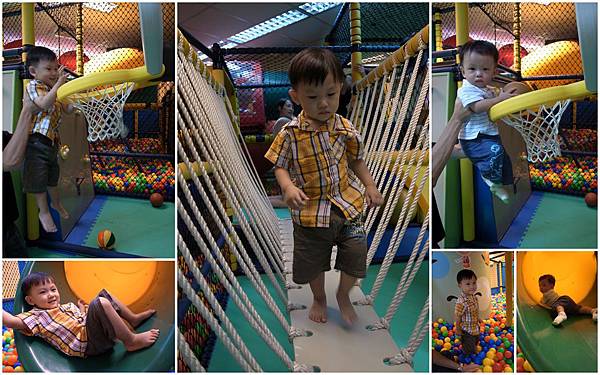 不得不說,裡頭的設備真的很多捏~光是那好大的球池呀~我們一家四口就在裡頭待了半個小時以上吧~哈!可惜球池上那彎彎曲曲滾筒狀的溜滑梯,小恩不敢一個人玩(我們大人不能陪小孩溜,哈~應該是會垮掉吧~)、阿倫倫太小,不敢放手讓他滑下去,待下回再來征服!!小恩不用我們多說,就自個兒在平衡橋上走來走去,很穩捏!!