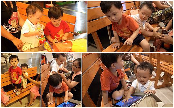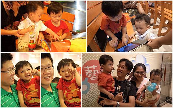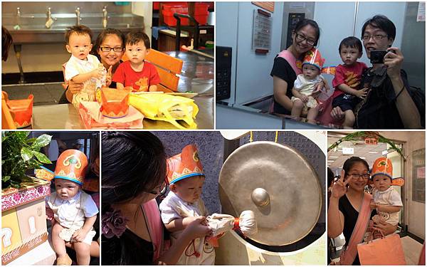 抓週當天,情商阿吉哥擔任司機,接送我們一家到士林郭元益糕餅博物館,不只如此還要充當小恩的保母、和攝影師,真是辛苦了,大感謝呀!!炎炎夏日的午後,真是要命的熱,抓周的現場又是一片人山人海,活動還沒開始,看到這場景就先累了一半飛快的報了到,領了小禮物,在門口敲了智慧鑼、抽支幸運籤,就迅速上樓就找位子坐下來吹冷氣,呼...由於已經有過小恩抓周以及阿倫倫收涎的經驗,對郭元益的作業流程很清楚,Dear更是早就準備好IPad來哄兩個小傢伙,這樣我們才總算能稍稍喘口氣喝口涼的啦!!