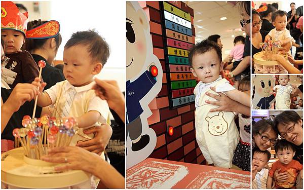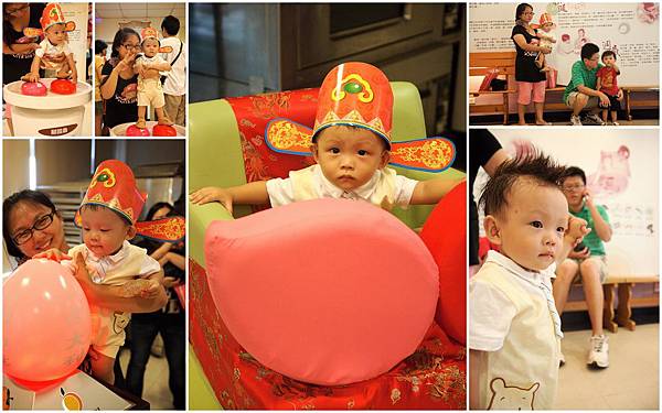 等主持人叫號輪到阿倫倫時,先去踩踩紅麵龜、坐坐幸福桃子椅,再摸一下平安如意燈,嘿嘿就要進入重頭戲,來去抓週囉阿倫倫今兒個穿的衣服是外婆出資,Dear選的唷小小的領帶,再配上那豎起來頭毛,看起來就是帥斃了哈哈!