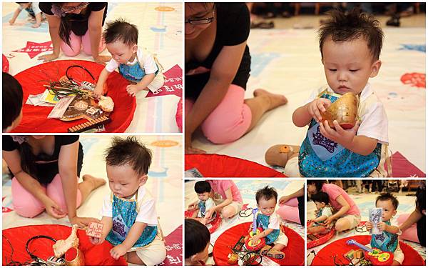 套上可愛的藍色小肚兜,預備...爬雖說今天是個大日子,但我們家的臭臉倫可不是浪得虛名,依然是臭著一張小臉,動也不動,為娘的我,只好拉他的手,一步一步往竹篩走去。一屁股坐下,看著已經在竹篩旁邊玩起來的小恩,不落人後的,阿倫倫一把就抓起了---大元寶,哈哈哈工作人員眼尖看到阿倫倫抓到元寶也馬上送上祝福,祝福阿倫倫大富大貴!嘻...謝謝捏放下大元寶,阿倫倫隨即又拿起了大雞腿,噗真不愧是米蟲的兒子,既愛錢又愛吃呀!讚讚讚!!