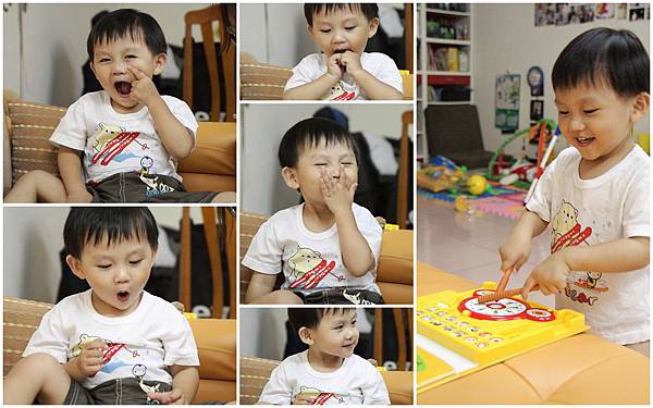 為了小恩跟阿倫倫,Dear的IPad裡面下載的不少給小朋友玩的小東西,有一個喜怒哀樂九種表情小娃娃,有陣子小恩就會比著上面的圖案,開始擠眉弄眼學起來,一下吐舌頭、一下微笑(不露齒的)、一下咧嘴大笑、一下哭哭(兩隻小手還會在眼睛下面轉轉,裝哭泣擦淚!!),還會把嘴巴弄成小小的O(驚訝狀),有難度的眨一隻眼,被小恩學起來卻成了擠眉弄眼,爆好笑。那陣子,米蟲也完全不顧形象,跟小恩比著誰的表情比較好笑,小恩作起來就是可愛,反觀我這個媽...唉...還是別作怪了~哈哈!!
