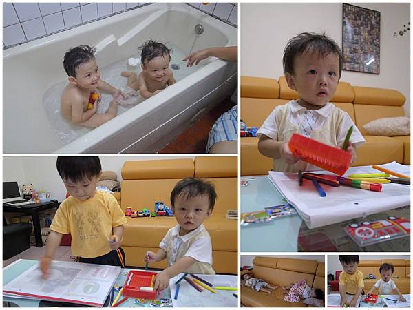 阿倫倫的黏踢踢還是三不五時會發作一下,我在廁所他就一定要進來(光是開著門讓他看到還不夠,一定要走進來才行),我在廚房他也一定要跟(一關廚房門他就會失控大哭),起床看不到我一樣是大哭,我幫小恩洗澡時,他找不到我也是大哭,噗...怎麼被我一寫,還是這麼愛哭~哈哈哈!!有好很多了啦~跟以前比,真的好很多了啦~~對當媽的來說,阿倫倫跨出的一小步就是媽媽成功的一大步啦!!