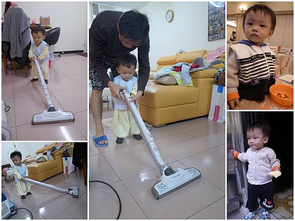 行動方面呢~走穩、蹲穩、也會跨門檻了、也會自己坐小椅子,自行下床下沙發很順暢了,家裡頭的沙發偶爾也能爬上去,現在就等他再長高一點,就可以自行爬上床囉~阿不過,雖然爬不上床,可是阿倫倫居然會爬上學步車,媽呀~學步車會滑動呀~這小子居然在我們不注意的時候表演特技,只是多半會卡住,要上不上要下不下的該該叫搬救兵呀!!哈哈~這叫作"假ㄍㄠˊ"~學步車現在當成阿倫倫的用餐車,只要吃東西時,阿倫倫就會坐進去,他就會自己雙手並用吃吃吃囉~~