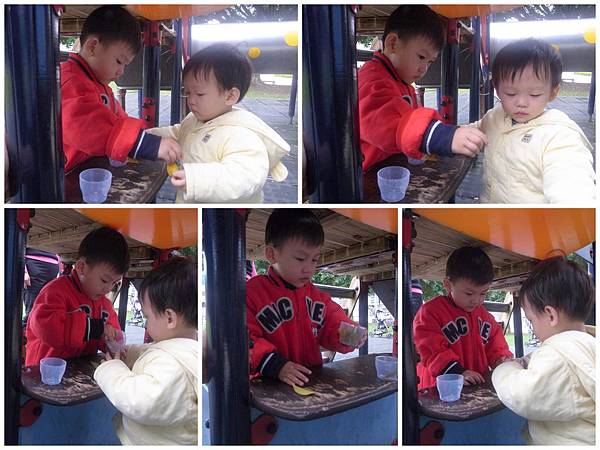 今兒個發現了新玩法,就是扮家家酒,小恩先是看到哥哥姐姐玩了一遍(他不敢去跟哥哥姐姐玩),待哥哥姊姊們離開後,他就鑽小屋去,一時間找不到用具,小小的臉兒就皺了起來,"媽媽,沒有東西賣咧~"
