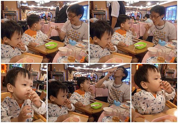 因為有喝酒,店家提供了一口杯,小子簡直玩瘋了,一人拿一杯,到處乾呀瞧他們倆個喝酒的氣勢,一口就吼乾啦這...是遺傳嗎??哈哈這樣好,以後不怕沒人陪公公、大爺小酌了結果,兩個小傢伙沒吃多少,卻乾了N百杯,裝了一肚子的水呀後來連小靚妹也被傳染了,抓著小杯到處乾乾乾噗拍謝被我們家兩個臭小子帶壞了!(阿嘉還太小,不然肯定要湊熱鬧乾一杯的啦呵呵!!)