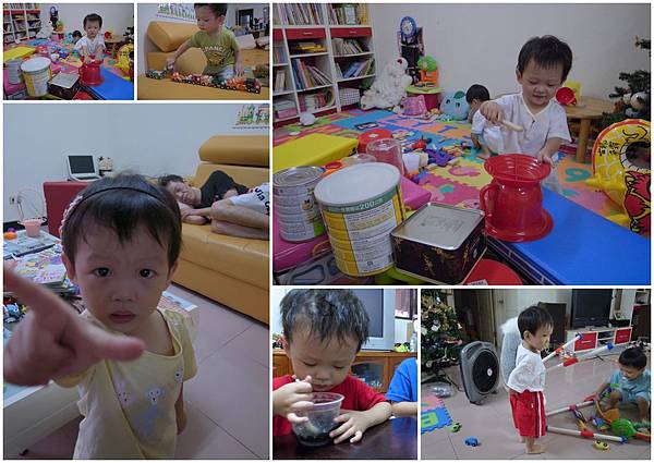 上頭的照片是,為娘的我想來場打擊樂,把家裡頭所有能打出聲音來的鍋、盆、桶全體拿出來,敲敲樂結果...一點都不悅耳,但母子三人卻玩得很愉快!!