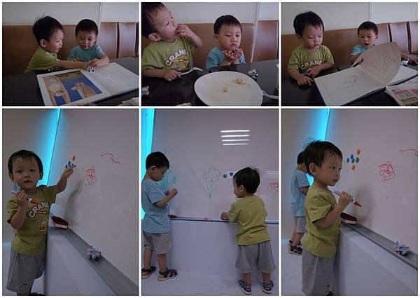 看起來一目了然簡簡單單的肉蛋吐司,很香的烤肉片+煎蛋+淡淡的美乃滋+有點多的胡椒粉,再用兩片鬆軟的吐司夾起來,但卻有種單純的美味,好吃吶兩個小子吃蘿蔔糕還不夠,把我的煎蛋、吐司都抓去吃了,好啦感謝兩位小傢伙幫阿母我進行節食計畫吃飽後就跟著大爺進公司啦雖然是周末,但還是有好幾位客服同事在工作著,我們在Dear的位子上待了一會兒,兩個小子就開始趴趴走了,辦公室的partition正好讓兩個小傢伙玩躲貓貓,吼...兩個小不點超好躲的咧玩很HIGH,但怕妨礙其他同事工作,於是帶小傢伙們到會議室去,讓他們享受畫白板的樂趣,瞧,這兩小子玩得多開心吶(真的好想買黑板壁貼,在家畫畫喔!)