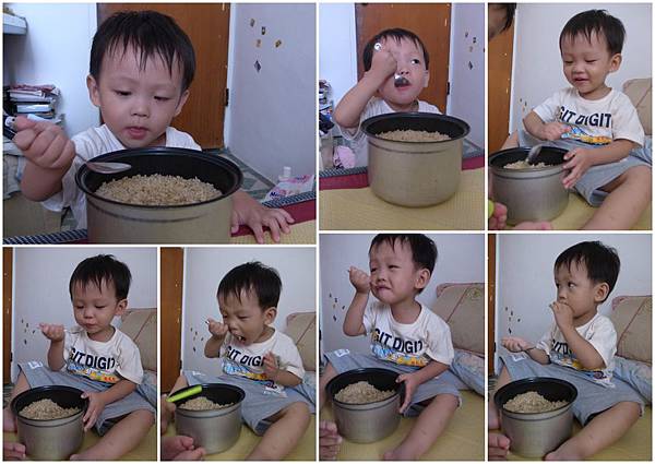米蟲娘家正在走健康風,所以改吃糙米飯,阿倫倫居然捧著一整鍋的飯就這樣乾吃了起來,原本在床上補眠的我,馬上抓起相機來拍,超屌的,小飯桶一個吶~(不過哄了半天,在一旁看阿倫倫吃飯就笑翻天的小恩依然不為所動,一口都不吃,唉...)