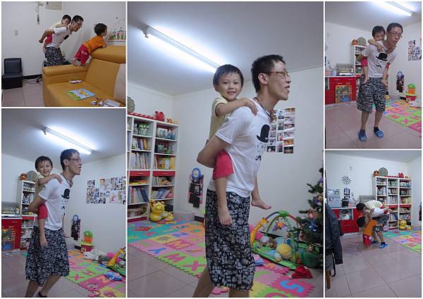 因為小恩大了抱起來不順手(腳太長),所以每當小恩走不動時,公公跟Dear就是用背的來解決,背著背著就被成習慣,小恩超愛人家背他,在家裡動不動也吵著要背,Dear背起小恩可就沒玩完了,不但小恩不肯下來,連阿倫倫都會吵著也要背,(因為阿母我堅持不背--一個字"懶")也就這樣Dear在這個時候變得超紅超搶手的,後面背一個胸口還要卡一個,哈哈哈~
