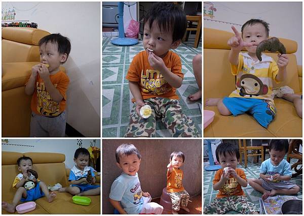 說到阿倫倫跟爸拔,也明顯地感覺兩個人越來越麻吉~阿倫倫會纏著爸拔講話,要爸拔唸書就算了,還會主動說要坐在爸拔大腿上聽,最常掛在最邊的口頭禪變成"餵爸拔吃東西",對爸拔超好的說!!讓爸拔一整個心花朵朵開呀~開心到還會跟米蟲剖析阿倫倫的心態、相處之道--要用誇獎的方式比較容易讓阿倫倫達到我們要求的事情(米蟲心裡o.s.小子都兩歲多了,你現在才知道怎麼跟他相處喔~不過還是很高興能有機會跟這位爸拔談心吶!),而且我們家這位爸拔還會"老邱賣瓜",說阿倫倫越來越帥了(因為阿倫倫像他呀~噗~真不知道是在誇誰~)