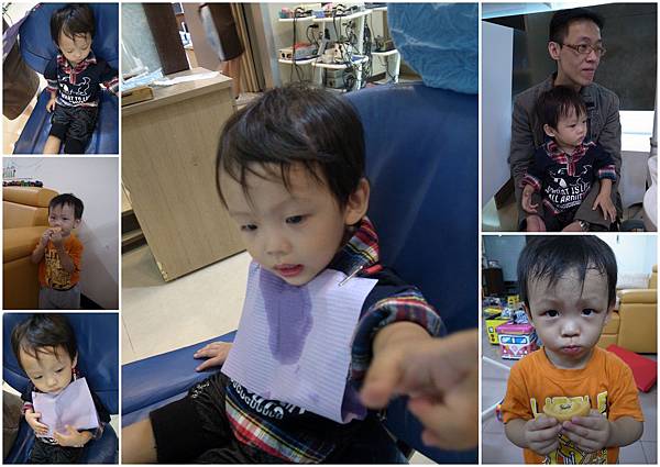 阿倫倫的牙齒檢查事件,事前的心理建設、小恩哥哥的示範,的確起了作用,阿倫倫乖乖的坐上診療椅,圍上圍兜,漱口清潔,然後躺下...就當一切貌似順利的時候,醫生叔叔的一句"來,張開嘴巴",像是開啟潘朵拉盒子的那把該死鑰匙,也像是踩到阿倫倫內心的地雷般,阿倫倫突然放聲大哭、尖叫掙扎著要跳下來,真要命~哭到整間牙科的人都在看,現在是發生什麼事~跟小恩的表現形成強烈的對比,哭鬧了有十幾二十分鐘,醫生護士都靠邊閃,最後是阿母我抱著阿倫倫一起躺到診療椅,但阿倫倫還是超不配合,嘴巴張不大,強迫不來,所以醫生又只勉強在前面幾顆牙齒上塗了一點點氟,就把阿倫倫放生了~下定決心,下次一定要約到有名的小兒牙科,讓專業的醫生來幫忙。(讓父母自己處理孩子情緒,不干涉的醫生或許也是一種專業,但在我的感受裡卻是一種袖手旁觀的厭惡感,所以還是換個醫生吧~)