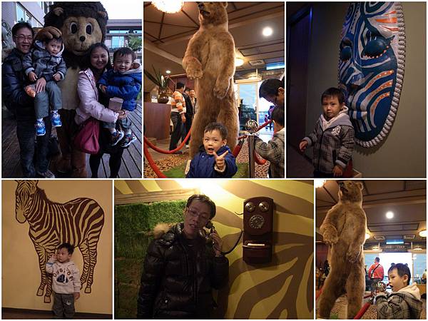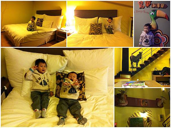 不過小子們更興奮的是,房間裡有樓中樓,樓上還有兩大張床,一會兒爬到樓上的大床去咚咚咚亂跳一通,一會兒走下樓吃點心喝飲料,小桌子小椅子全讓他們推著玩大搬風,兩小傢伙就這樣上上下下的爬不停玩個沒完,而且米蟲事前有先預約,所以六福莊提供了床圍給我們(防護小子們不要滾下床),本來計畫要去看非洲迎賓舞的,但小子們在房間玩得超開心,叫也叫不動,等我們到現場人家的表演早就結束了,阿~~~看看時間就直接去吃晚餐,這兒吃晚餐也是要預約餐廳預約時段的喔~(啥都要預約是有沒有那麼誇張~)