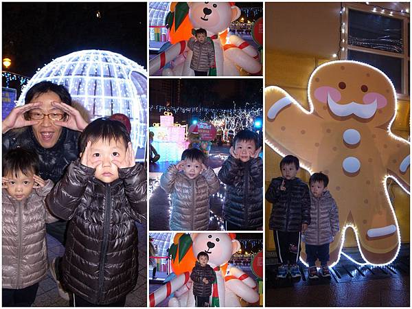 小子們最喜歡的是冰屋,雖然沒有進去晃一圈,但在外面拍照,他們就很開心了~還有薑餅人、麋鹿(小恩跟阿倫倫還爬上去,不知道行不行,但一旁的工作人員沒有制止我們,應該是可以吧~哈哈!!)還有小熊禮物堆呢!!