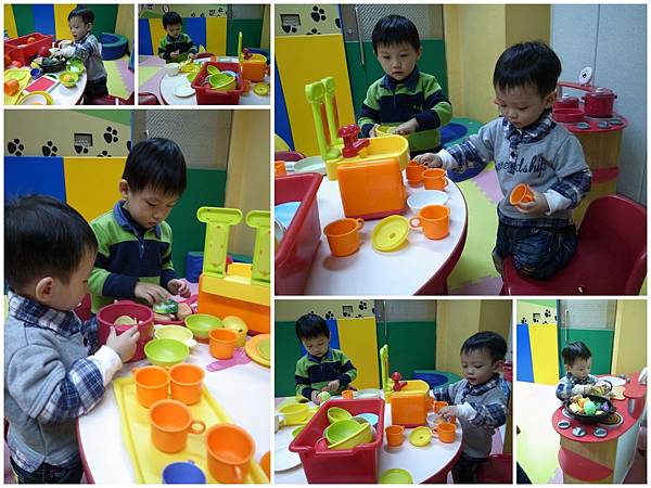 這裡有瓦斯爐台、大烤箱、冰箱、櫥櫃、洗手台...連小娃兒可以走進去的超大娃娃屋都有,基本的鍋碗瓢盆、蔬果魚肉、食品飲料等配件就不用說,更是多到爆炸~當阿母的我難得有機會當貴婦,就坐在小椅子上,等著兩位小廚師大展身手,端上各式各樣的好料~真的吃到撐死了~哈哈!!