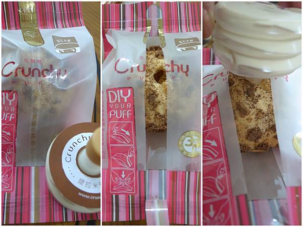 要吃的時候,從外包裝中間撕開(很像三角御飯糰),就會剛剛好露出泡芙上面的那個小洞,對準小洞將冰涼的內餡用力給他擠~~進去,就大功告成,可以開始享用囉。