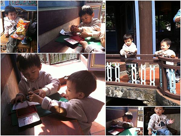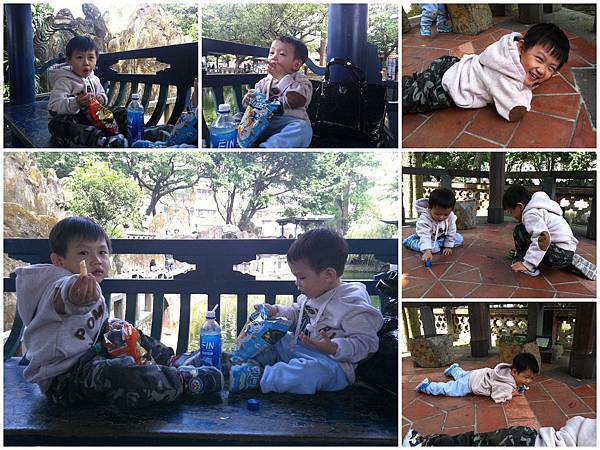 餵魚行程太早結束(只能用秒殺來形容),只好拿出小子們隨身攜帶的小車,讓他們在涼亭玩,玩到HIGH了還直接趴在地上兩人自己演起車子來,沿著地磚的線條開始飆車,衝過來撞過去,阿母我越是嚇阻他們笑的越大聲,好啦~我也不是真心要他們停下來,不過就是配合演出罷了~愛玩就去玩吧~