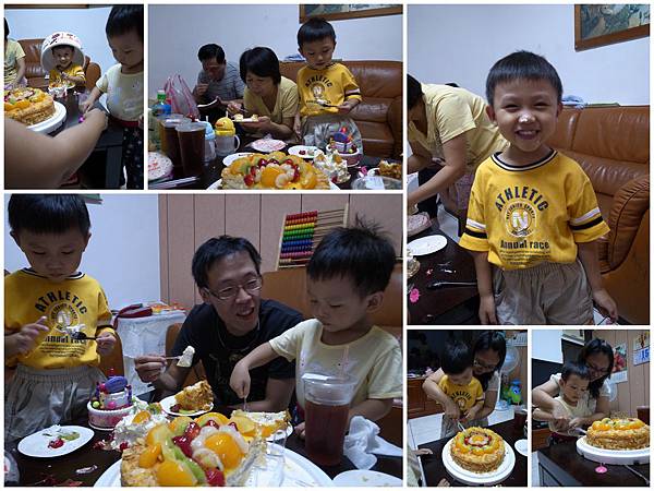 小恩指定要奶油蛋糕,可公公帶阿倫倫去買蛋糕時,阿倫倫卻選了個芋泥水果蛋糕(還很剛好的最外層一點奶油都沒有,真是萬中選一呀~)所以婆婆額外買了個小小的鮮奶油蛋糕專於小恩,真是幸福的小子呀!!