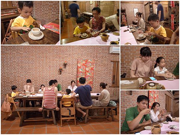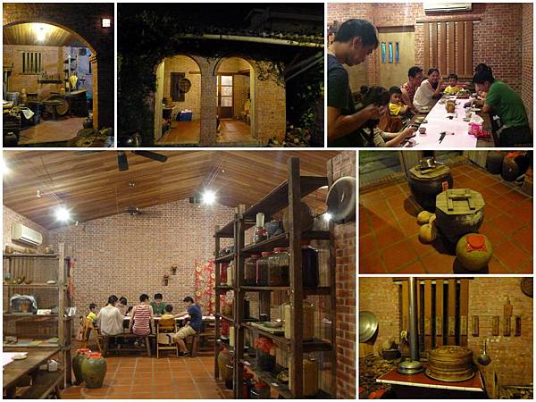 小子們對外頭的大缸、大甕超有興趣,叩叩摸摸個沒完,夏日夜晚的風涼涼得好舒服,我們站在院子裡還欣賞到了蟲兒們的多重奏,太有FU了啦!!廳內有木頭的大桌、長板凳、花花的布(有客家風)、燭台、連餐具都是老闆純手工捏製窯燒出來的,每一個都不一樣,超有型的~不過也都很有份量,很擔心小子們打破!